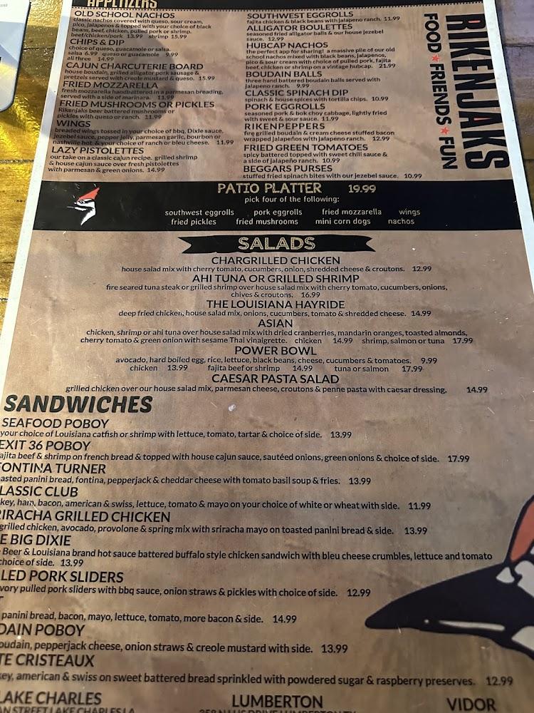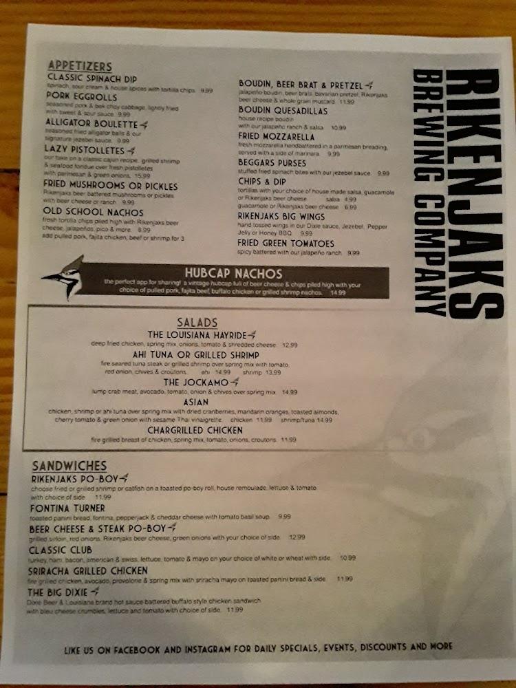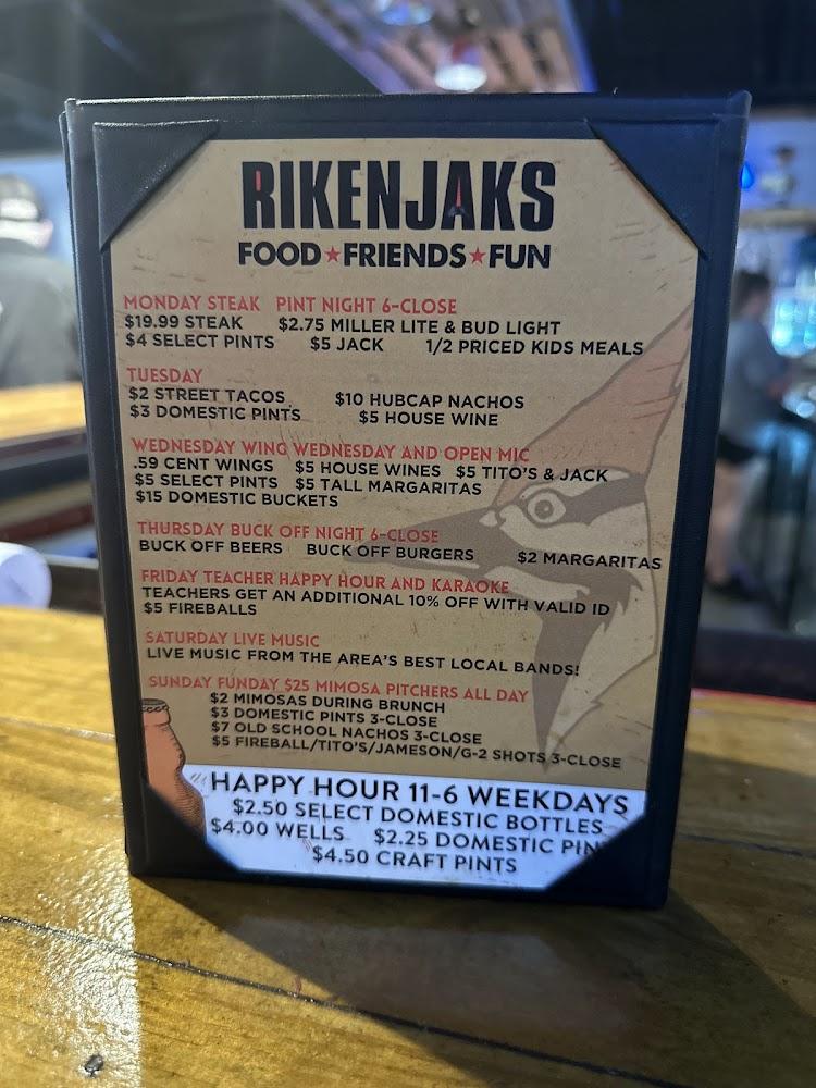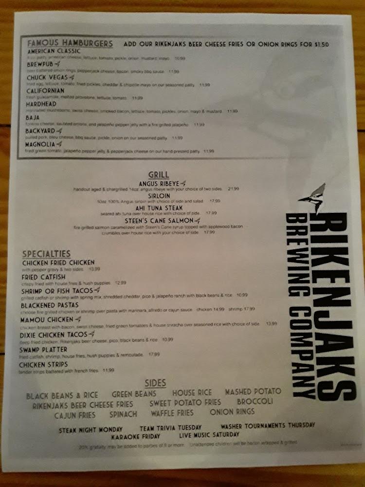 The Rikenjaks menu is a mix of Southern comfort food and classic bar bites. Popular choices include New Orleans Pasta and the Fais Do Do Seafood Tower. The kids' menu has favorites like mini corn dogs and chicken nuggets, catering to younger guests.